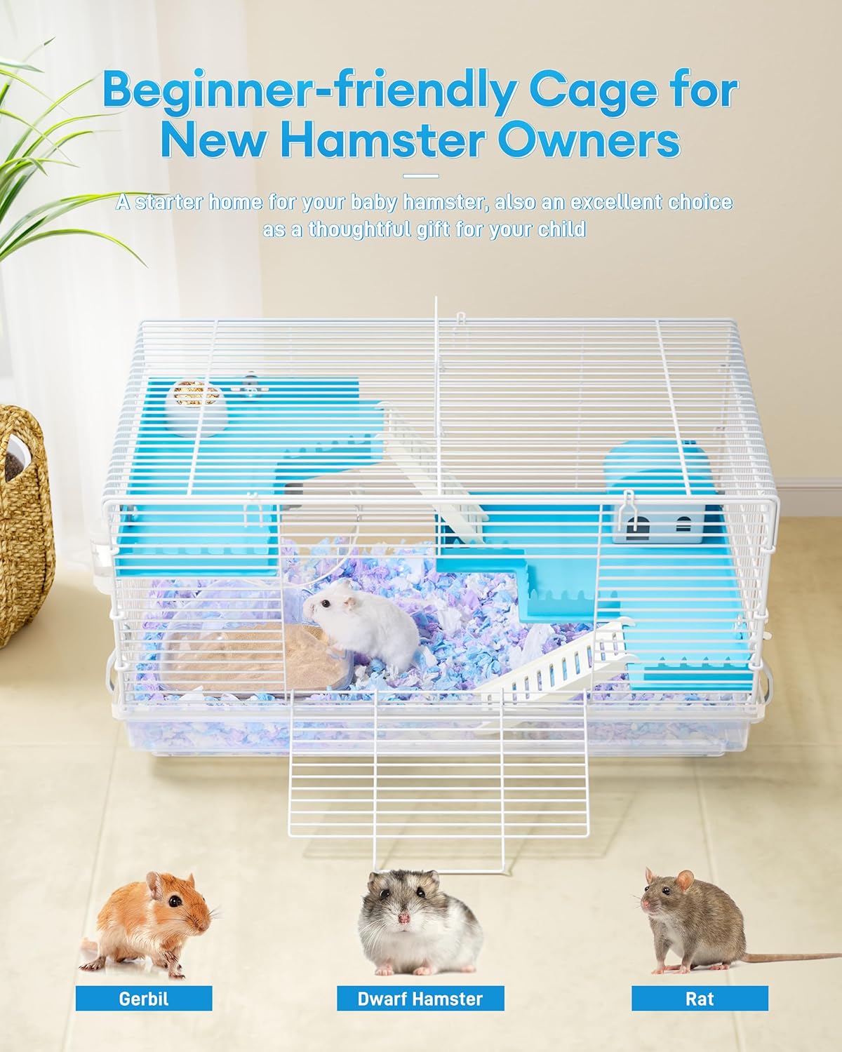- 【Great Starter Hamster Cage】Measures 18.5"x11.8"x11.8" (LxWxH), designs with a safety 3/8" narrow mesh space. The front door (7.68"L x 5.71"H) makes feeding, cleaning, and bonding with your small animal effortless.