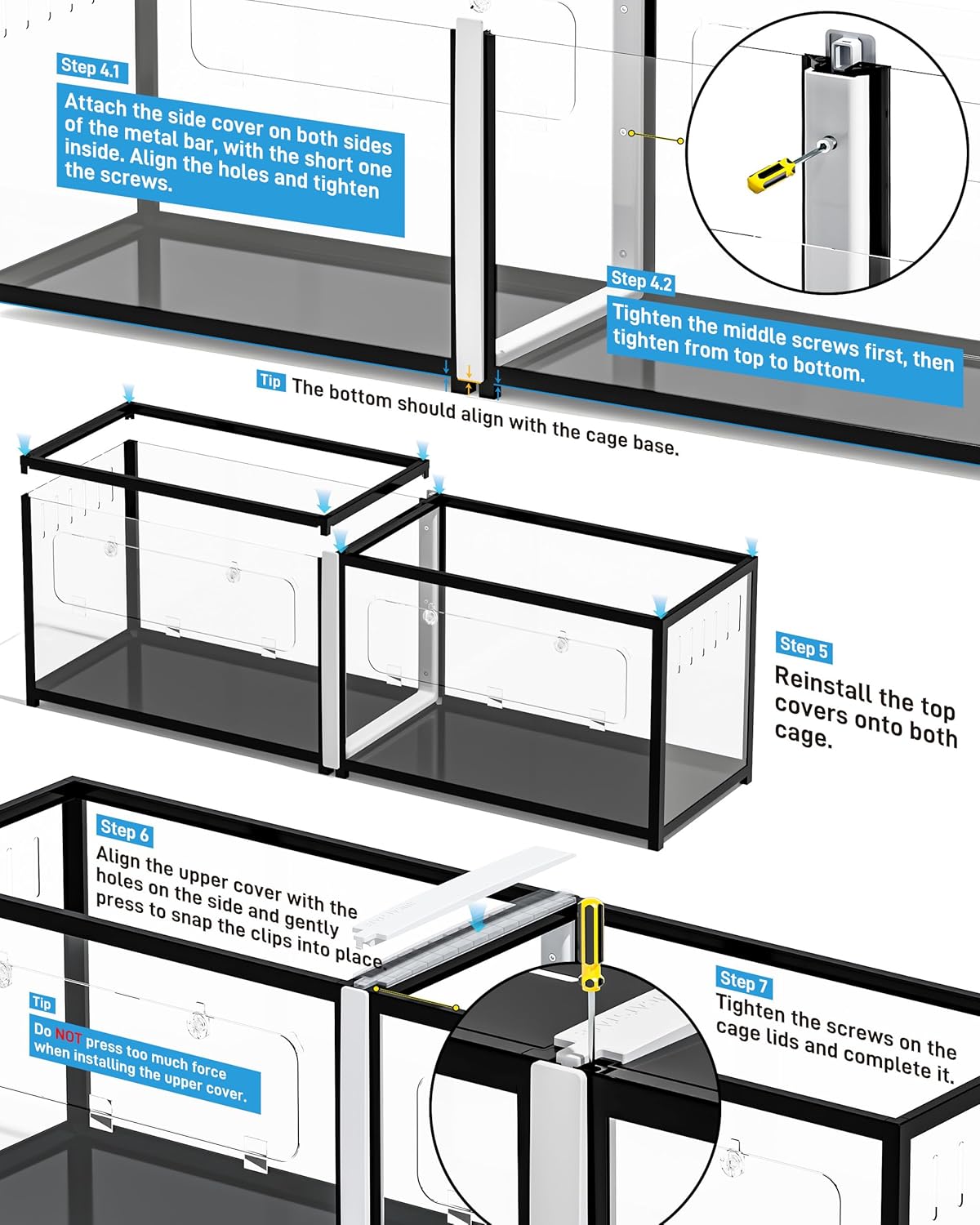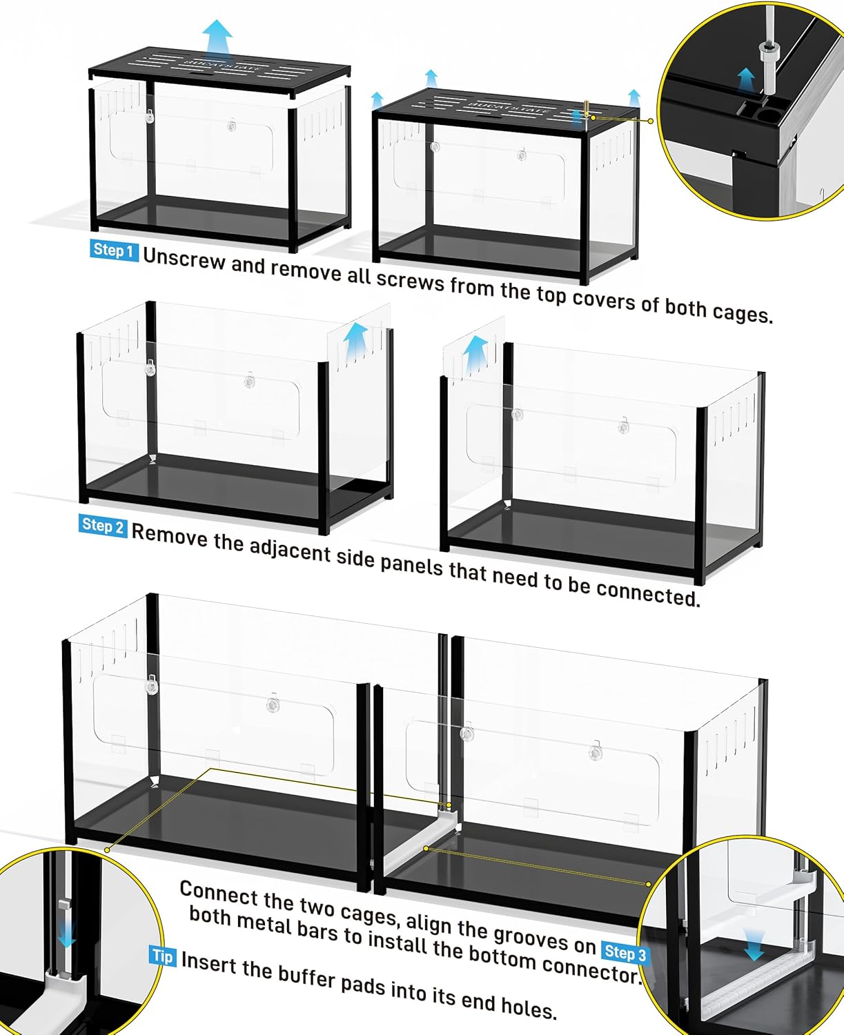 • Easy installation: Remove the adjacent side panels that need to be connected, then follow the instruction to install the four-side connectors.